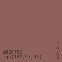Цвет #8E615C в цветовой модели RGB обозначается тремя октетами (142, 97, 92) в десятичном формате и #8E615C в шестнадцатиричном (hex) формате, которые являются интенсивностью красного 142 (hex 8E), интенсивность зелёного 97 (hex 61) и интенсивность синего 92 (hex 5C).