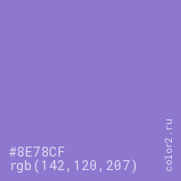 Цвет #8E78CF в цветовой модели RGB обозначается тремя октетами (142, 120, 207) в десятичном формате и #8E78CF в шестнадцатиричном (hex) формате, которые являются интенсивностью красного 142 (hex 8E), интенсивность зелёного 120 (hex 78) и интенсивность синего 207 (hex CF).