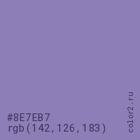 Цвет #8E7EB7 в цветовой модели RGB обозначается тремя октетами (142, 126, 183) в десятичном формате и #8E7EB7 в шестнадцатиричном (hex) формате, которые являются интенсивностью красного 142 (hex 8E), интенсивность зелёного 126 (hex 7E) и интенсивность синего 183 (hex B7).
