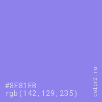 Цвет #8E81EB в цветовой модели RGB обозначается тремя октетами (142, 129, 235) в десятичном формате и #8E81EB в шестнадцатиричном (hex) формате, которые являются интенсивностью красного 142 (hex 8E), интенсивность зелёного 129 (hex 81) и интенсивность синего 235 (hex EB).