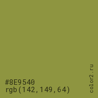 Цвет #8E9540 в цветовой модели RGB обозначается тремя октетами (142, 149, 64) в десятичном формате и #8E9540 в шестнадцатиричном (hex) формате, которые являются интенсивностью красного 142 (hex 8E), интенсивность зелёного 149 (hex 95) и интенсивность синего 64 (hex 40).