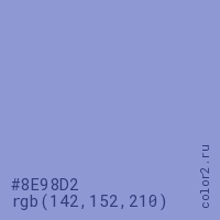 Цвет #8E98D2 в цветовой модели RGB обозначается тремя октетами (142, 152, 210) в десятичном формате и #8E98D2 в шестнадцатиричном (hex) формате, которые являются интенсивностью красного 142 (hex 8E), интенсивность зелёного 152 (hex 98) и интенсивность синего 210 (hex D2).