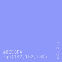 Цвет #8E98FA в цветовой модели RGB обозначается тремя октетами (142, 152, 250) в десятичном формате и #8E98FA в шестнадцатиричном (hex) формате, которые являются интенсивностью красного 142 (hex 8E), интенсивность зелёного 152 (hex 98) и интенсивность синего 250 (hex FA).