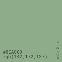 Цвет #8EAC89 в цветовой модели RGB обозначается тремя октетами (142, 172, 137) в десятичном формате и #8EAC89 в шестнадцатиричном (hex) формате, которые являются интенсивностью красного 142 (hex 8E), интенсивность зелёного 172 (hex AC) и интенсивность синего 137 (hex 89).