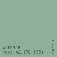 Цвет #8EB09B в цветовой модели RGB обозначается тремя октетами (142, 176, 155) в десятичном формате и #8EB09B в шестнадцатиричном (hex) формате, которые являются интенсивностью красного 142 (hex 8E), интенсивность зелёного 176 (hex B0) и интенсивность синего 155 (hex 9B).