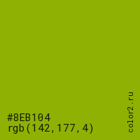 Цвет #8EB104 в цветовой модели RGB обозначается тремя октетами (142, 177, 4) в десятичном формате и #8EB104 в шестнадцатиричном (hex) формате, которые являются интенсивностью красного 142 (hex 8E), интенсивность зелёного 177 (hex B1) и интенсивность синего 4 (hex 04).