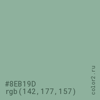 Цвет #8EB19D в цветовой модели RGB обозначается тремя октетами (142, 177, 157) в десятичном формате и #8EB19D в шестнадцатиричном (hex) формате, которые являются интенсивностью красного 142 (hex 8E), интенсивность зелёного 177 (hex B1) и интенсивность синего 157 (hex 9D).