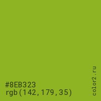 Цвет #8EB323 в цветовой модели RGB обозначается тремя октетами (142, 179, 35) в десятичном формате и #8EB323 в шестнадцатиричном (hex) формате, которые являются интенсивностью красного 142 (hex 8E), интенсивность зелёного 179 (hex B3) и интенсивность синего 35 (hex 23).