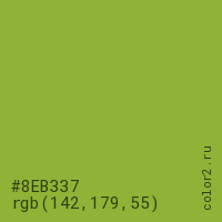 Цвет #8EB337 в цветовой модели RGB обозначается тремя октетами (142, 179, 55) в десятичном формате и #8EB337 в шестнадцатиричном (hex) формате, которые являются интенсивностью красного 142 (hex 8E), интенсивность зелёного 179 (hex B3) и интенсивность синего 55 (hex 37).
