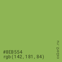 Цвет #8EB554 в цветовой модели RGB обозначается тремя октетами (142, 181, 84) в десятичном формате и #8EB554 в шестнадцатиричном (hex) формате, которые являются интенсивностью красного 142 (hex 8E), интенсивность зелёного 181 (hex B5) и интенсивность синего 84 (hex 54).