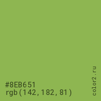 Цвет #8EB651 в цветовой модели RGB обозначается тремя октетами (142, 182, 81) в десятичном формате и #8EB651 в шестнадцатиричном (hex) формате, которые являются интенсивностью красного 142 (hex 8E), интенсивность зелёного 182 (hex B6) и интенсивность синего 81 (hex 51).