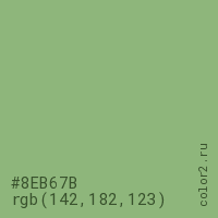 Цвет #8EB67B в цветовой модели RGB обозначается тремя октетами (142, 182, 123) в десятичном формате и #8EB67B в шестнадцатиричном (hex) формате, которые являются интенсивностью красного 142 (hex 8E), интенсивность зелёного 182 (hex B6) и интенсивность синего 123 (hex 7B).