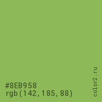 Цвет #8EB958 в цветовой модели RGB обозначается тремя октетами (142, 185, 88) в десятичном формате и #8EB958 в шестнадцатиричном (hex) формате, которые являются интенсивностью красного 142 (hex 8E), интенсивность зелёного 185 (hex B9) и интенсивность синего 88 (hex 58).
