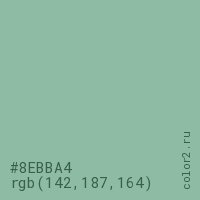 Цвет #8EBBA4 в цветовой модели RGB обозначается тремя октетами (142, 187, 164) в десятичном формате и #8EBBA4 в шестнадцатиричном (hex) формате, которые являются интенсивностью красного 142 (hex 8E), интенсивность зелёного 187 (hex BB) и интенсивность синего 164 (hex A4).