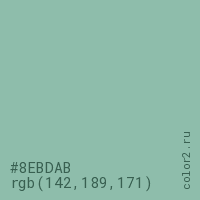 Цвет #8EBDAB в цветовой модели RGB обозначается тремя октетами (142, 189, 171) в десятичном формате и #8EBDAB в шестнадцатиричном (hex) формате, которые являются интенсивностью красного 142 (hex 8E), интенсивность зелёного 189 (hex BD) и интенсивность синего 171 (hex AB).