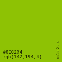 Цвет #8EC204 в цветовой модели RGB обозначается тремя октетами (142, 194, 4) в десятичном формате и #8EC204 в шестнадцатиричном (hex) формате, которые являются интенсивностью красного 142 (hex 8E), интенсивность зелёного 194 (hex C2) и интенсивность синего 4 (hex 04).