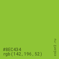 Цвет #8EC434 в цветовой модели RGB обозначается тремя октетами (142, 196, 52) в десятичном формате и #8EC434 в шестнадцатиричном (hex) формате, которые являются интенсивностью красного 142 (hex 8E), интенсивность зелёного 196 (hex C4) и интенсивность синего 52 (hex 34).