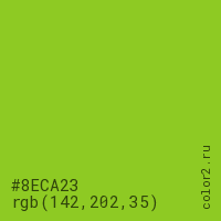 Цвет #8ECA23 в цветовой модели RGB обозначается тремя октетами (142, 202, 35) в десятичном формате и #8ECA23 в шестнадцатиричном (hex) формате, которые являются интенсивностью красного 142 (hex 8E), интенсивность зелёного 202 (hex CA) и интенсивность синего 35 (hex 23).
