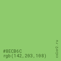 Цвет #8ECB6C в цветовой модели RGB обозначается тремя октетами (142, 203, 108) в десятичном формате и #8ECB6C в шестнадцатиричном (hex) формате, которые являются интенсивностью красного 142 (hex 8E), интенсивность зелёного 203 (hex CB) и интенсивность синего 108 (hex 6C).