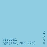 Цвет #8ECDE2 в цветовой модели RGB обозначается тремя октетами (142, 205, 226) в десятичном формате и #8ECDE2 в шестнадцатиричном (hex) формате, которые являются интенсивностью красного 142 (hex 8E), интенсивность зелёного 205 (hex CD) и интенсивность синего 226 (hex E2).