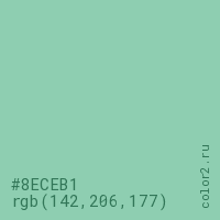 Цвет #8ECEB1 в цветовой модели RGB обозначается тремя октетами (142, 206, 177) в десятичном формате и #8ECEB1 в шестнадцатиричном (hex) формате, которые являются интенсивностью красного 142 (hex 8E), интенсивность зелёного 206 (hex CE) и интенсивность синего 177 (hex B1).