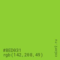 Цвет #8ED031 в цветовой модели RGB обозначается тремя октетами (142, 208, 49) в десятичном формате и #8ED031 в шестнадцатиричном (hex) формате, которые являются интенсивностью красного 142 (hex 8E), интенсивность зелёного 208 (hex D0) и интенсивность синего 49 (hex 31).