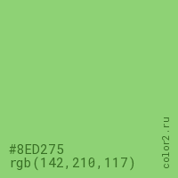 Цвет #8ED275 в цветовой модели RGB обозначается тремя октетами (142, 210, 117) в десятичном формате и #8ED275 в шестнадцатиричном (hex) формате, которые являются интенсивностью красного 142 (hex 8E), интенсивность зелёного 210 (hex D2) и интенсивность синего 117 (hex 75).