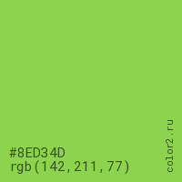 Цвет #8ED34D в цветовой модели RGB обозначается тремя октетами (142, 211, 77) в десятичном формате и #8ED34D в шестнадцатиричном (hex) формате, которые являются интенсивностью красного 142 (hex 8E), интенсивность зелёного 211 (hex D3) и интенсивность синего 77 (hex 4D).