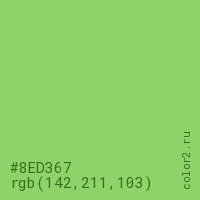 Цвет #8ED367 в цветовой модели RGB обозначается тремя октетами (142, 211, 103) в десятичном формате и #8ED367 в шестнадцатиричном (hex) формате, которые являются интенсивностью красного 142 (hex 8E), интенсивность зелёного 211 (hex D3) и интенсивность синего 103 (hex 67).