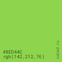 Цвет #8ED44C в цветовой модели RGB обозначается тремя октетами (142, 212, 76) в десятичном формате и #8ED44C в шестнадцатиричном (hex) формате, которые являются интенсивностью красного 142 (hex 8E), интенсивность зелёного 212 (hex D4) и интенсивность синего 76 (hex 4C).