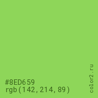 Цвет #8ED659 в цветовой модели RGB обозначается тремя октетами (142, 214, 89) в десятичном формате и #8ED659 в шестнадцатиричном (hex) формате, которые являются интенсивностью красного 142 (hex 8E), интенсивность зелёного 214 (hex D6) и интенсивность синего 89 (hex 59).