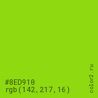 Цвет #8ED910 в цветовой модели RGB обозначается тремя октетами (142, 217, 16) в десятичном формате и #8ED910 в шестнадцатиричном (hex) формате, которые являются интенсивностью красного 142 (hex 8E), интенсивность зелёного 217 (hex D9) и интенсивность синего 16 (hex 10).