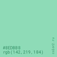 Цвет #8EDBB8 в цветовой модели RGB обозначается тремя октетами (142, 219, 184) в десятичном формате и #8EDBB8 в шестнадцатиричном (hex) формате, которые являются интенсивностью красного 142 (hex 8E), интенсивность зелёного 219 (hex DB) и интенсивность синего 184 (hex B8).