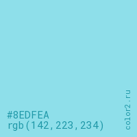 Цвет #8EDFEA в цветовой модели RGB обозначается тремя октетами (142, 223, 234) в десятичном формате и #8EDFEA в шестнадцатиричном (hex) формате, которые являются интенсивностью красного 142 (hex 8E), интенсивность зелёного 223 (hex DF) и интенсивность синего 234 (hex EA).