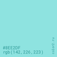 Цвет #8EE2DF в цветовой модели RGB обозначается тремя октетами (142, 226, 223) в десятичном формате и #8EE2DF в шестнадцатиричном (hex) формате, которые являются интенсивностью красного 142 (hex 8E), интенсивность зелёного 226 (hex E2) и интенсивность синего 223 (hex DF).
