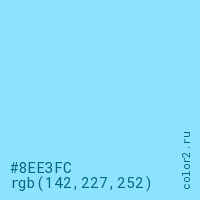 Цвет #8EE3FC в цветовой модели RGB обозначается тремя октетами (142, 227, 252) в десятичном формате и #8EE3FC в шестнадцатиричном (hex) формате, которые являются интенсивностью красного 142 (hex 8E), интенсивность зелёного 227 (hex E3) и интенсивность синего 252 (hex FC).