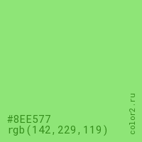 Цвет #8EE577 в цветовой модели RGB обозначается тремя октетами (142, 229, 119) в десятичном формате и #8EE577 в шестнадцатиричном (hex) формате, которые являются интенсивностью красного 142 (hex 8E), интенсивность зелёного 229 (hex E5) и интенсивность синего 119 (hex 77).