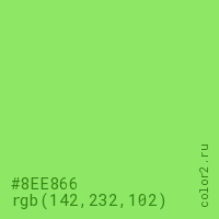 Цвет #8EE866 в цветовой модели RGB обозначается тремя октетами (142, 232, 102) в десятичном формате и #8EE866 в шестнадцатиричном (hex) формате, которые являются интенсивностью красного 142 (hex 8E), интенсивность зелёного 232 (hex E8) и интенсивность синего 102 (hex 66).