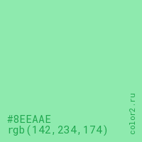 Цвет #8EEAAE в цветовой модели RGB обозначается тремя октетами (142, 234, 174) в десятичном формате и #8EEAAE в шестнадцатиричном (hex) формате, которые являются интенсивностью красного 142 (hex 8E), интенсивность зелёного 234 (hex EA) и интенсивность синего 174 (hex AE).