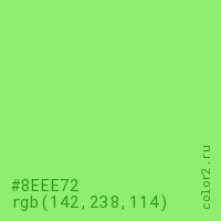 Цвет #8EEE72 в цветовой модели RGB обозначается тремя октетами (142, 238, 114) в десятичном формате и #8EEE72 в шестнадцатиричном (hex) формате, которые являются интенсивностью красного 142 (hex 8E), интенсивность зелёного 238 (hex EE) и интенсивность синего 114 (hex 72).
