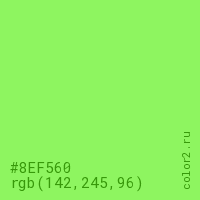 Цвет #8EF560 в цветовой модели RGB обозначается тремя октетами (142, 245, 96) в десятичном формате и #8EF560 в шестнадцатиричном (hex) формате, которые являются интенсивностью красного 142 (hex 8E), интенсивность зелёного 245 (hex F5) и интенсивность синего 96 (hex 60).