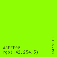 Цвет #8EFE05 в цветовой модели RGB обозначается тремя октетами (142, 254, 5) в десятичном формате и #8EFE05 в шестнадцатиричном (hex) формате, которые являются интенсивностью красного 142 (hex 8E), интенсивность зелёного 254 (hex FE) и интенсивность синего 5 (hex 05).