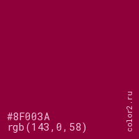 Цвет #8F003A в цветовой модели RGB обозначается тремя октетами (143, 0, 58) в десятичном формате и #8F003A в шестнадцатиричном (hex) формате, которые являются интенсивностью красного 143 (hex 8F), интенсивность зелёного 0 (hex 00) и интенсивность синего 58 (hex 3A).