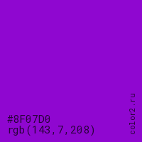 Цвет #8F07D0 в цветовой модели RGB обозначается тремя октетами (143, 7, 208) в десятичном формате и #8F07D0 в шестнадцатиричном (hex) формате, которые являются интенсивностью красного 143 (hex 8F), интенсивность зелёного 7 (hex 07) и интенсивность синего 208 (hex D0).