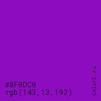 Цвет #8F0DC0 в цветовой модели RGB обозначается тремя октетами (143, 13, 192) в десятичном формате и #8F0DC0 в шестнадцатиричном (hex) формате, которые являются интенсивностью красного 143 (hex 8F), интенсивность зелёного 13 (hex 0D) и интенсивность синего 192 (hex C0).