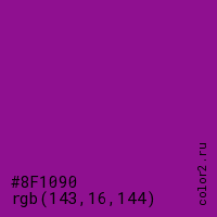 Цвет #8F1090 в цветовой модели RGB обозначается тремя октетами (143, 16, 144) в десятичном формате и #8F1090 в шестнадцатиричном (hex) формате, которые являются интенсивностью красного 143 (hex 8F), интенсивность зелёного 16 (hex 10) и интенсивность синего 144 (hex 90).