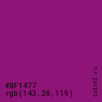 Цвет #8F1477 в цветовой модели RGB обозначается тремя октетами (143, 20, 119) в десятичном формате и #8F1477 в шестнадцатиричном (hex) формате, которые являются интенсивностью красного 143 (hex 8F), интенсивность зелёного 20 (hex 14) и интенсивность синего 119 (hex 77).