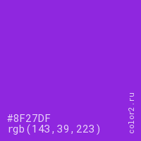Цвет #8F27DF в цветовой модели RGB обозначается тремя октетами (143, 39, 223) в десятичном формате и #8F27DF в шестнадцатиричном (hex) формате, которые являются интенсивностью красного 143 (hex 8F), интенсивность зелёного 39 (hex 27) и интенсивность синего 223 (hex DF).