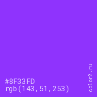 Цвет #8F33FD в цветовой модели RGB обозначается тремя октетами (143, 51, 253) в десятичном формате и #8F33FD в шестнадцатиричном (hex) формате, которые являются интенсивностью красного 143 (hex 8F), интенсивность зелёного 51 (hex 33) и интенсивность синего 253 (hex FD).