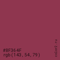 Цвет #8F364F в цветовой модели RGB обозначается тремя октетами (143, 54, 79) в десятичном формате и #8F364F в шестнадцатиричном (hex) формате, которые являются интенсивностью красного 143 (hex 8F), интенсивность зелёного 54 (hex 36) и интенсивность синего 79 (hex 4F).